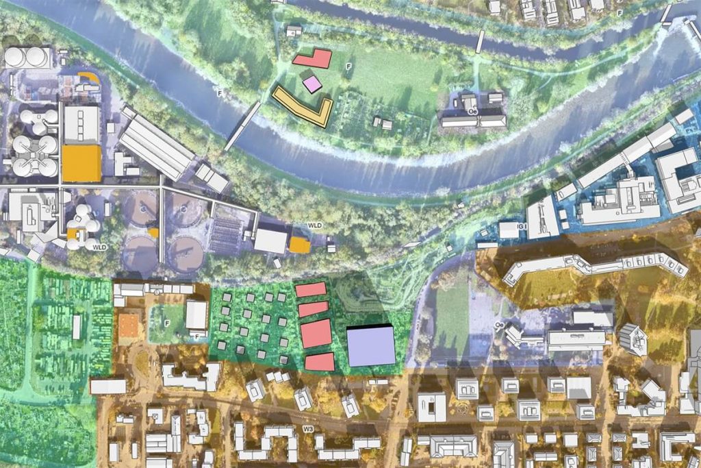 Con ortofotos de drones y modelos 3D, puede superponer edificios en su entorno para tener una idea clara de cómo se vería un nuevo edificio junto a uno existente.