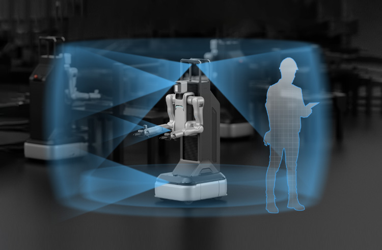 Safety is handled by a multi-sensor fusion system including 360° Lidar, four AI vision sensors (RGBD/Fisheye), and 6D force sensors. It features millisecond-level obstacle avoidance and arm-collision detection to work safely alongside human staff.