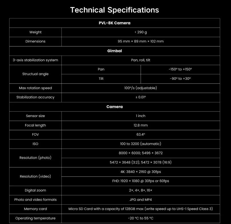 | Gimbal Rotation | Pitch: -120° to +30°; Yaw: ±160° |