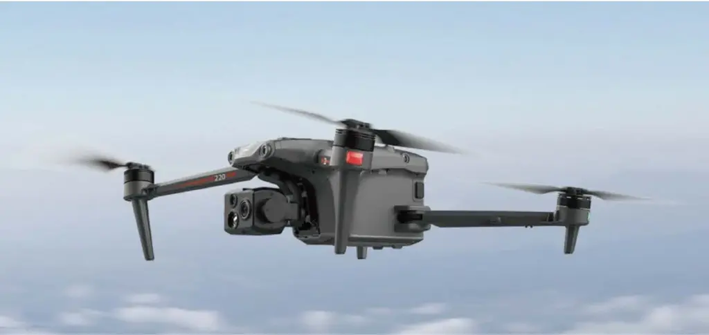 O GDU S220 É um quadricóptero de nível industrial equipado com um sistema de câmera tripla (grande angular, zoom e térmica) e computação de ponta com IA avançada para missões complexas, como inspeção de infraestrutura e resposta a emergências.